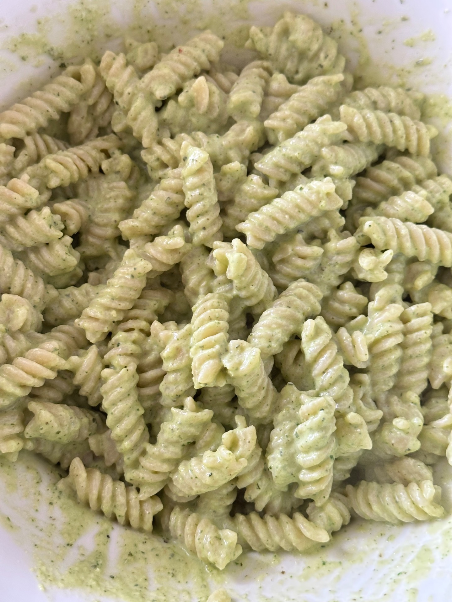 Kom squash, hvidløg, spinat, creme cheese og pastavand i en blender og blend til en cremet sauce. Tilpas smagen med salt og peber. Hæld kogevandet fra pastaen, og fedt pastaen ind i saucen.